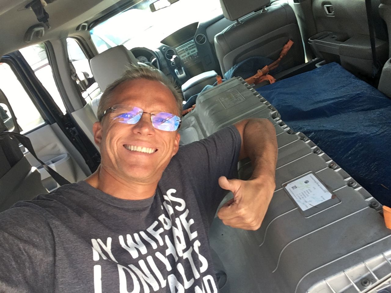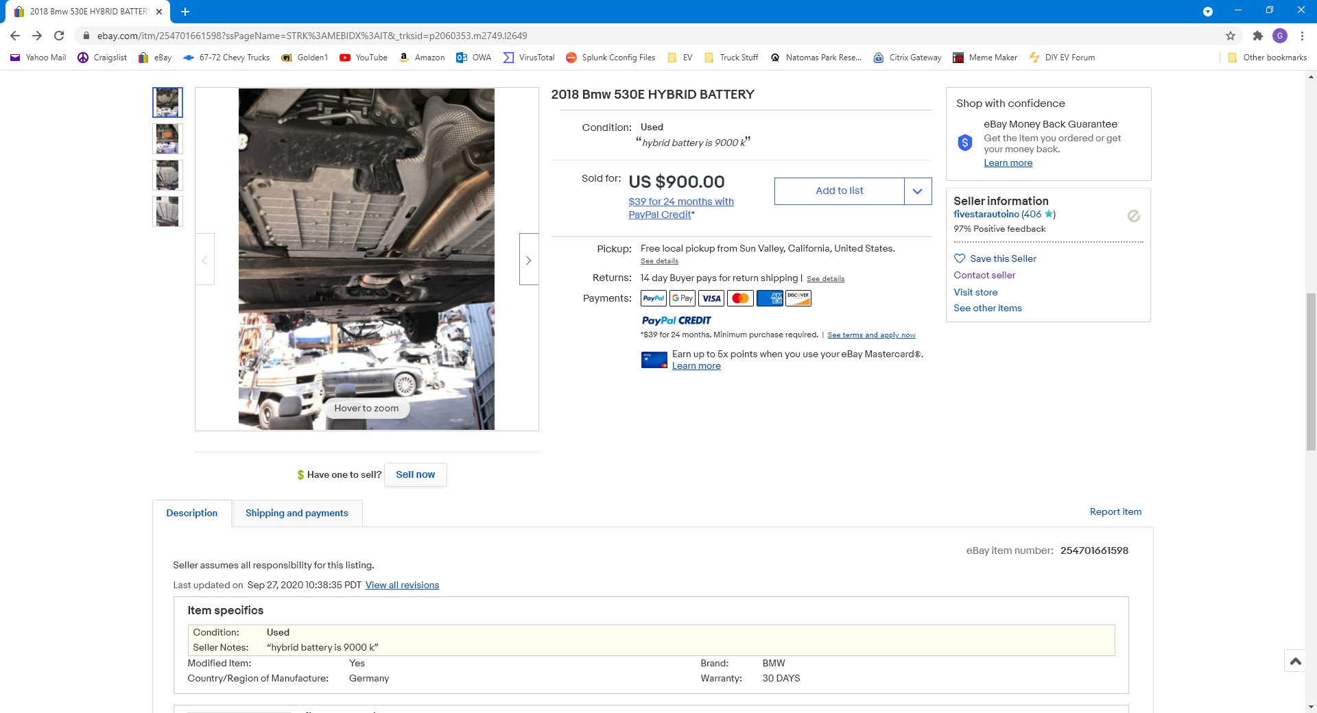 I meet a friend, a fellow forum member (or at least I call him that, I believe he calls me a stalker, ha ha) Anyway Artur has been a God send and has right away found me this BMW 530e hybrid full voltage battery pack on eBay for only $900 with free local pickup in Los Angeles, California. I offered them $700 and they accepted but then I asked for the high voltage orange wiring harness that goes with it and the price went back up to $900 but they threw in the low voltage black wire harness pig tails so I was happy with that deal.