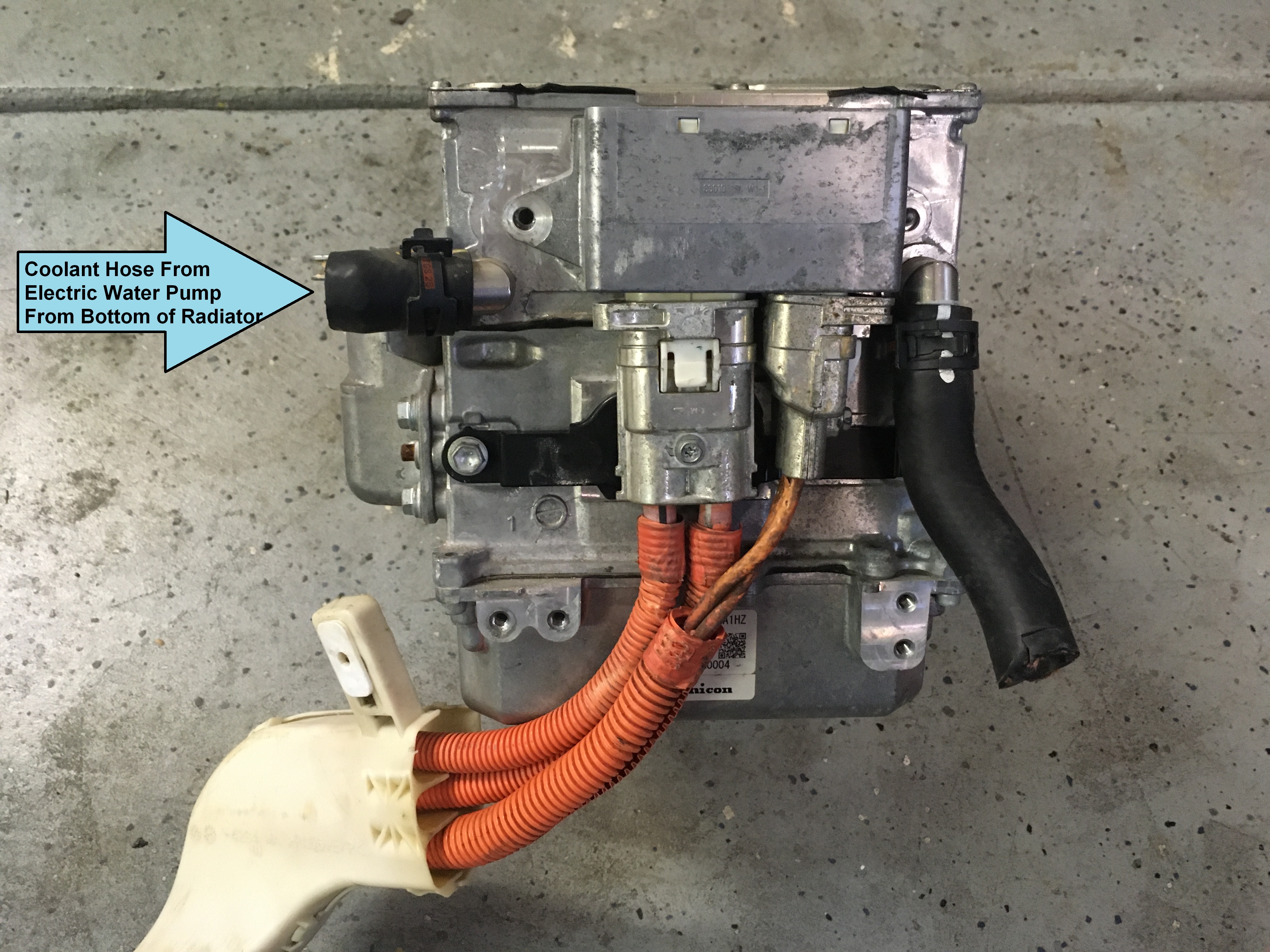 since we are already looking at this side of the Inverter lets label the rubber hoses, one goes to the top of the radiator and the other comes from the bottom of the radiator via an electric water pump