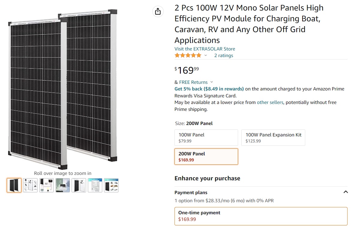 My requirements: buy a 100 watt solar panel so I could do the math easily as I add them up, 100 watts, 200 watts, 300 watts you get the idea