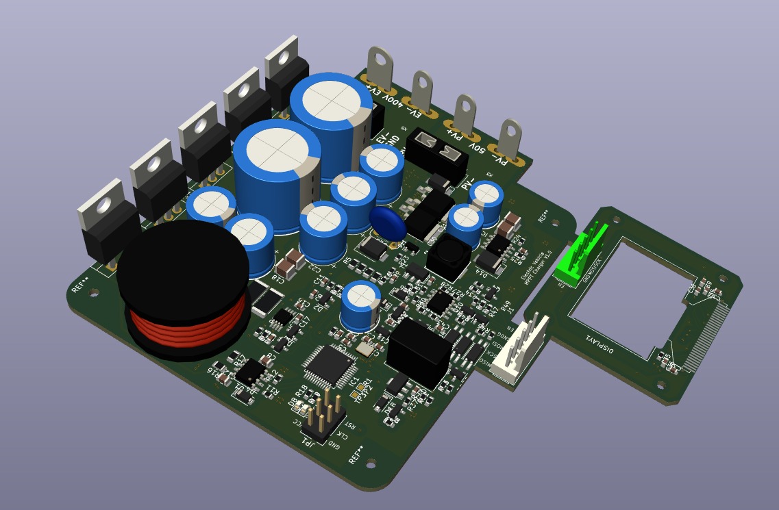 Then I realized behind the 12V battery there is a way to enter the driver cabin through cable trees already entering the car. So I added an SPI bus connector to the PCB so that a small LCD display can be connected showing the current MPPT Power, current and voltage rating. This SPI is galvanically seperated from all data, VCC and GND lines just in case. It's too risky to bring any potential high voltage cable into the drivers cabin otherwise. Atlernatively one could also use an ESP with Bluetooth to display the data on an android phone but since the MPPT is only powered when the sun is up and in any case is working very intermittendly I decided to use just that display.