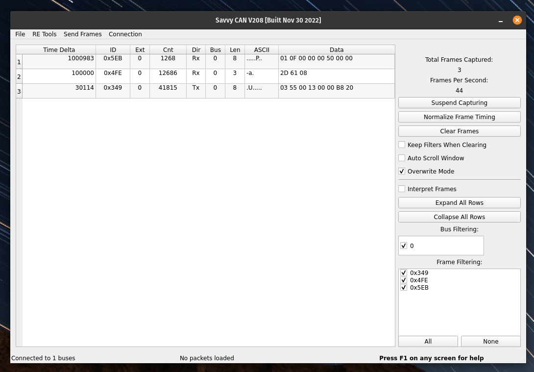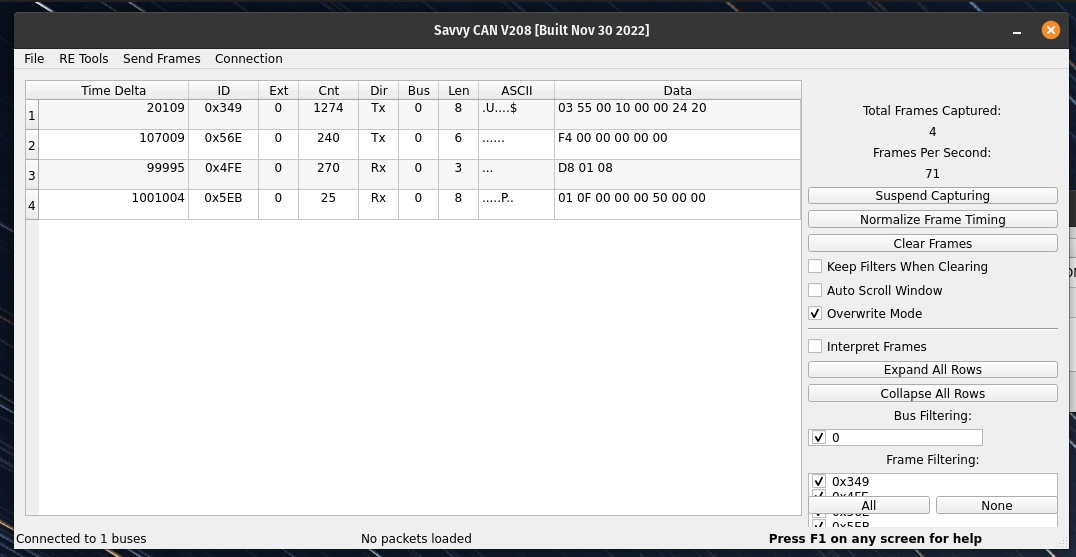 - The message 4FE looks encouraging because it only has one constantly changing byte (maybe counter or checksum, although it looks to change semi-randomly which makes me think checksum).