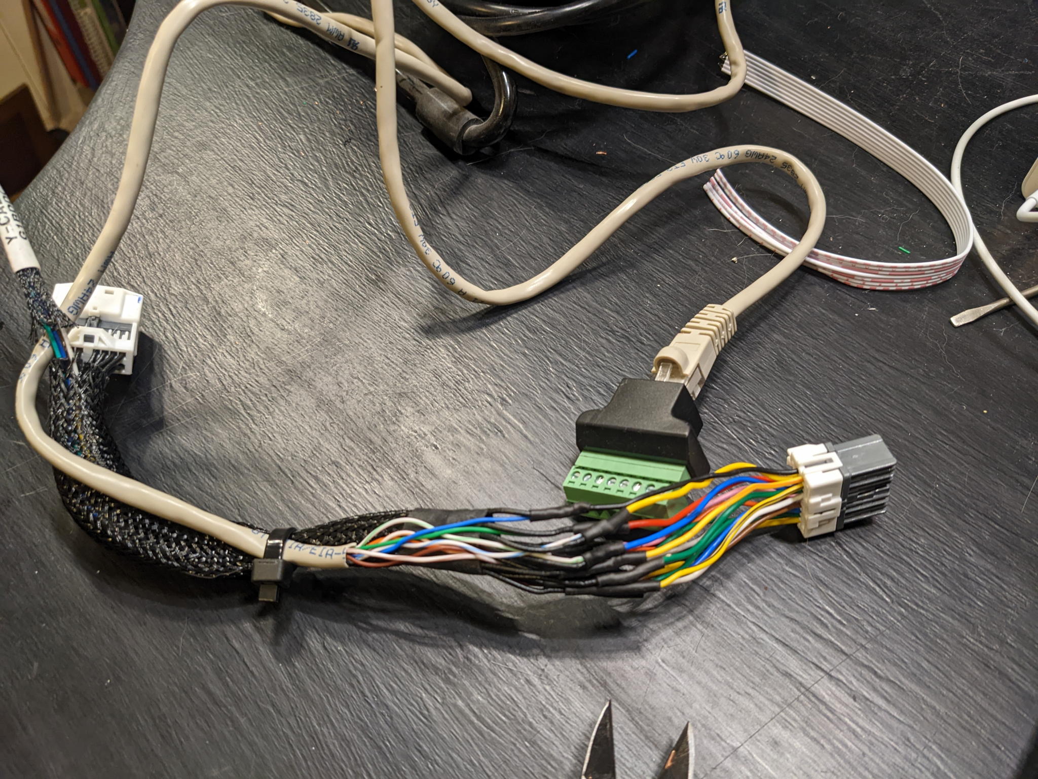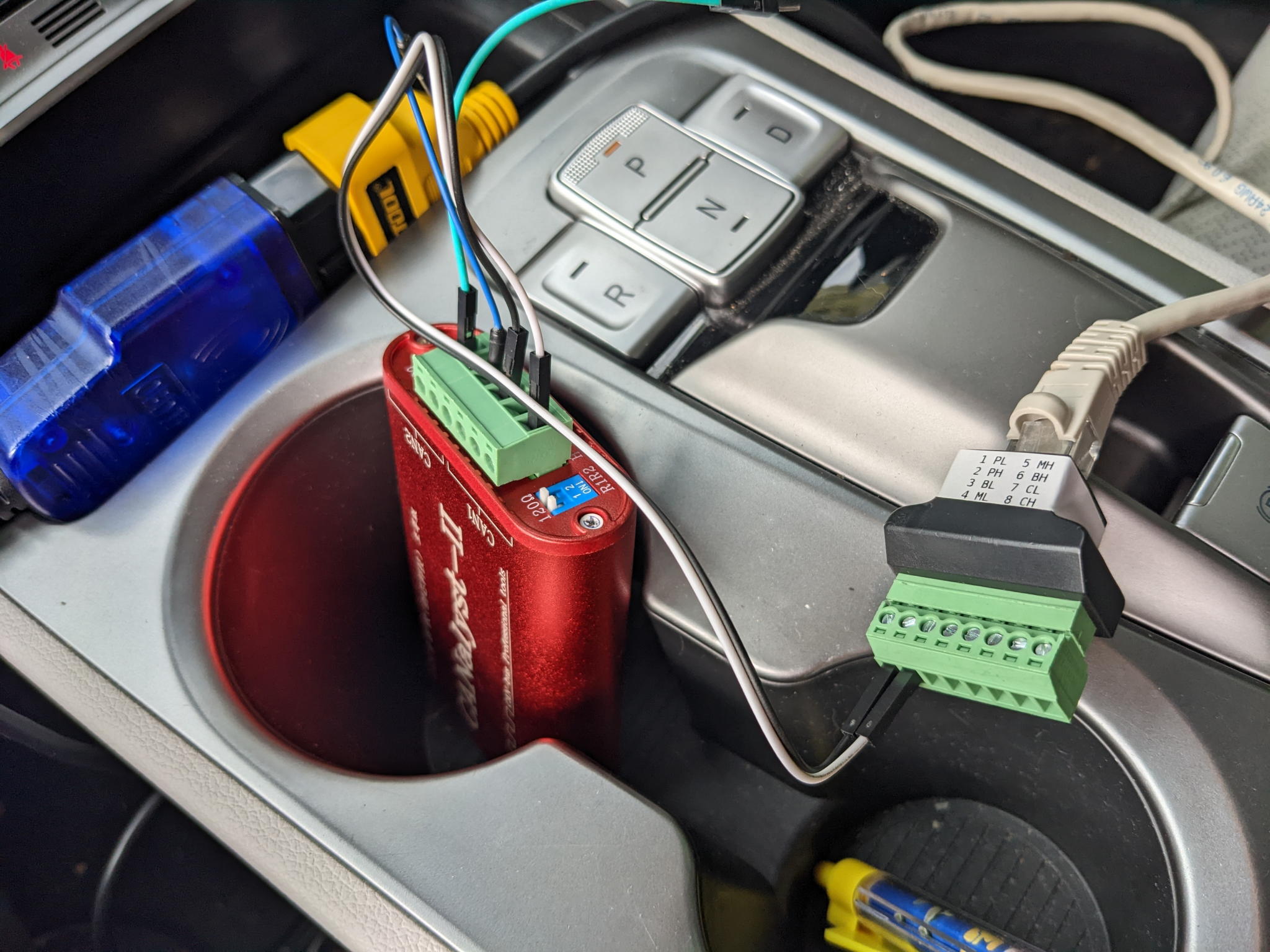 After several months delay when I broke a fine-pitched connector (friends don't let friends forward-probe their connectors, folks!) and bricked the car, I converted my car's "Hyundai Data Link Premium" Telemetry T-cable (I think an Australia-only implementation!) into a handy T-cable that breaks out PCAN, CCAN, BCAN and MCAN over CAT5 twisted pairs:
