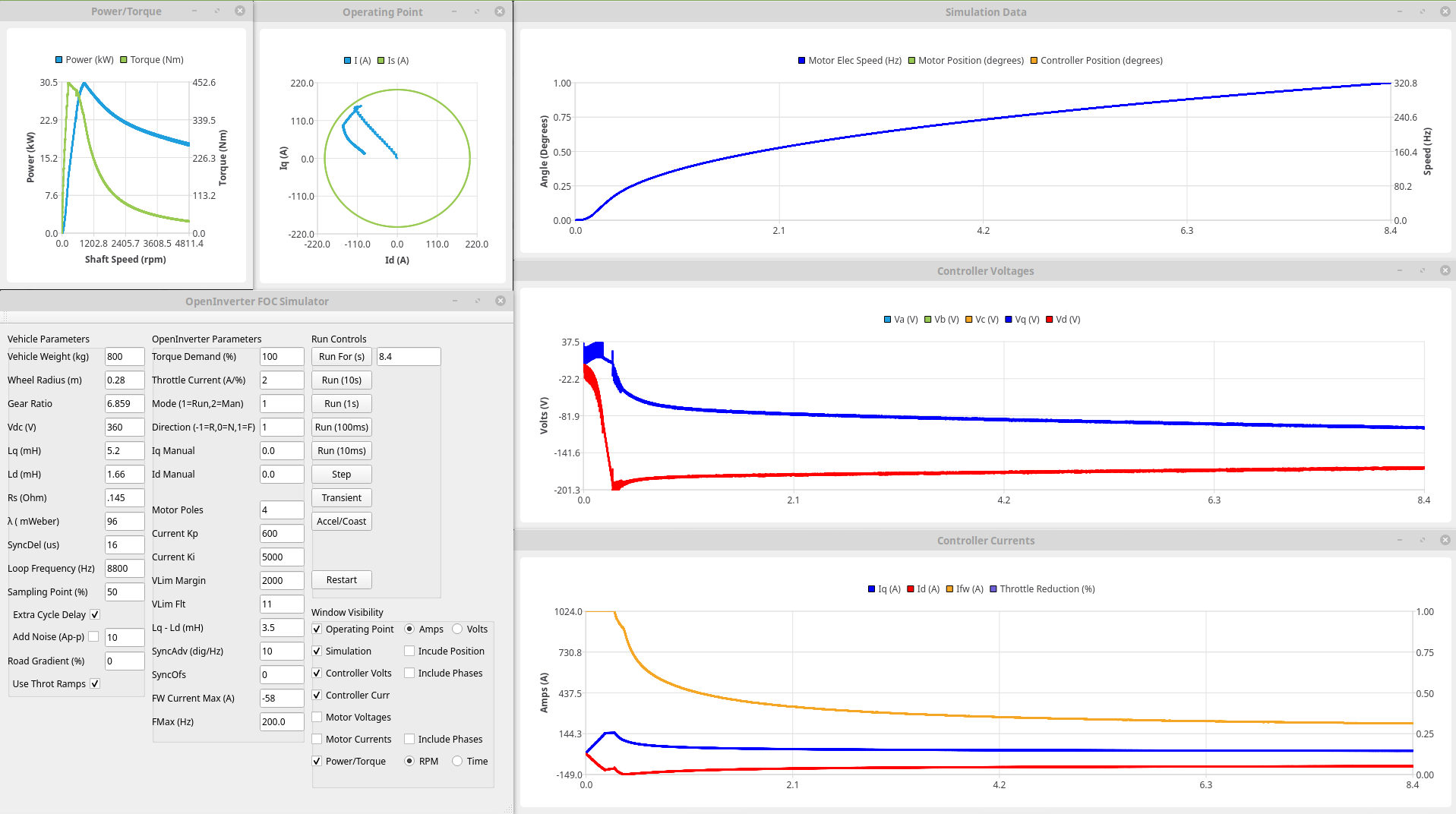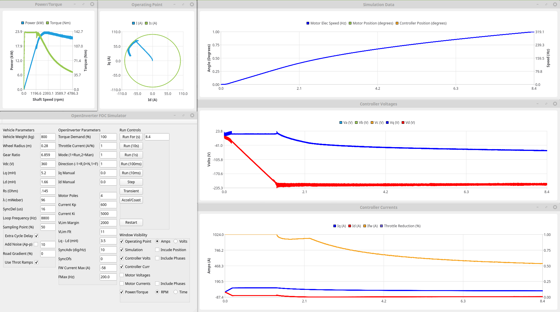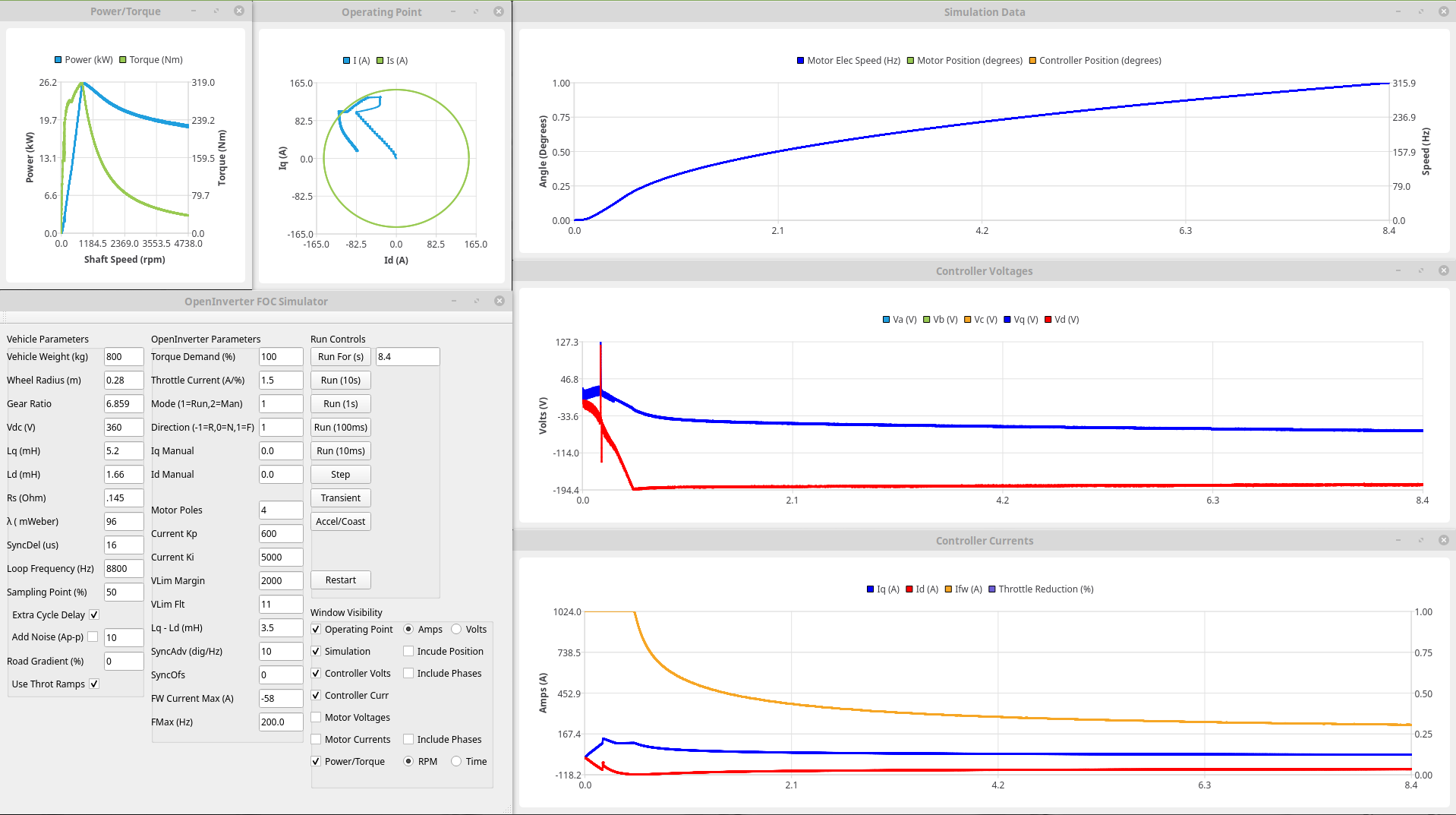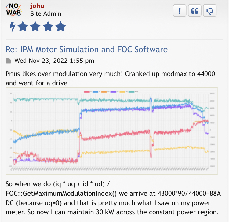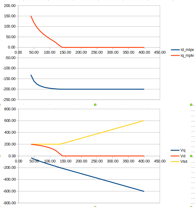 I've also been reading up a bit on Most Torque Per Volt (MTPV) algorithms, in particular, where the operating point should be at each point. Now rather than trying to code stuff up straight away it seemed sensible to test the principle first so here is a plot where I'm trying to over-ride the controllers to force the operating point to roughly where it should be using manualiq and manual id (afraid it only goes up to 2.4krpm because the control loops have an increasing tendency to oscillate if I get it slightly wrong): Now I couldn't get it to go quite where I wanted (and the above took quite a few attempts to get anywhere close) but the peak power is up to 32kW (ish, I saw nearer 35 on one run) and is still up at 24kW at 2400rpm so a gain of around 25%. I'm sure there is more there too once the operating point is right over where it should be (following the Is circle round before heading to the critical current point), at least another 10%?
