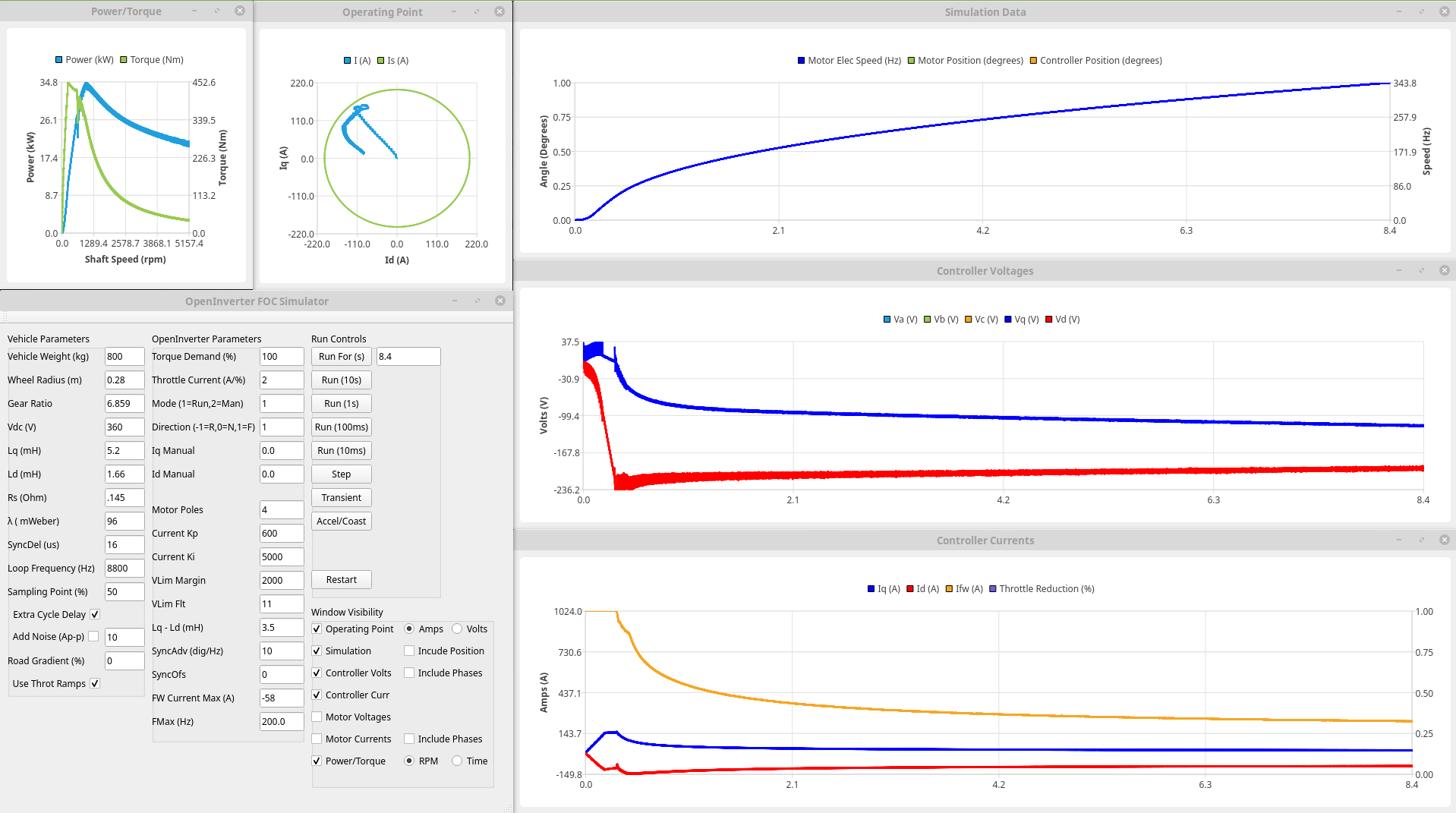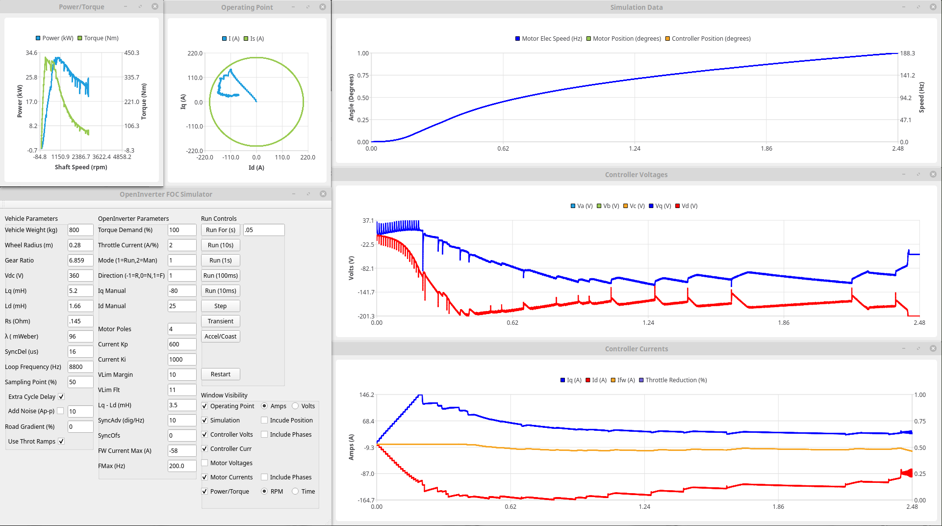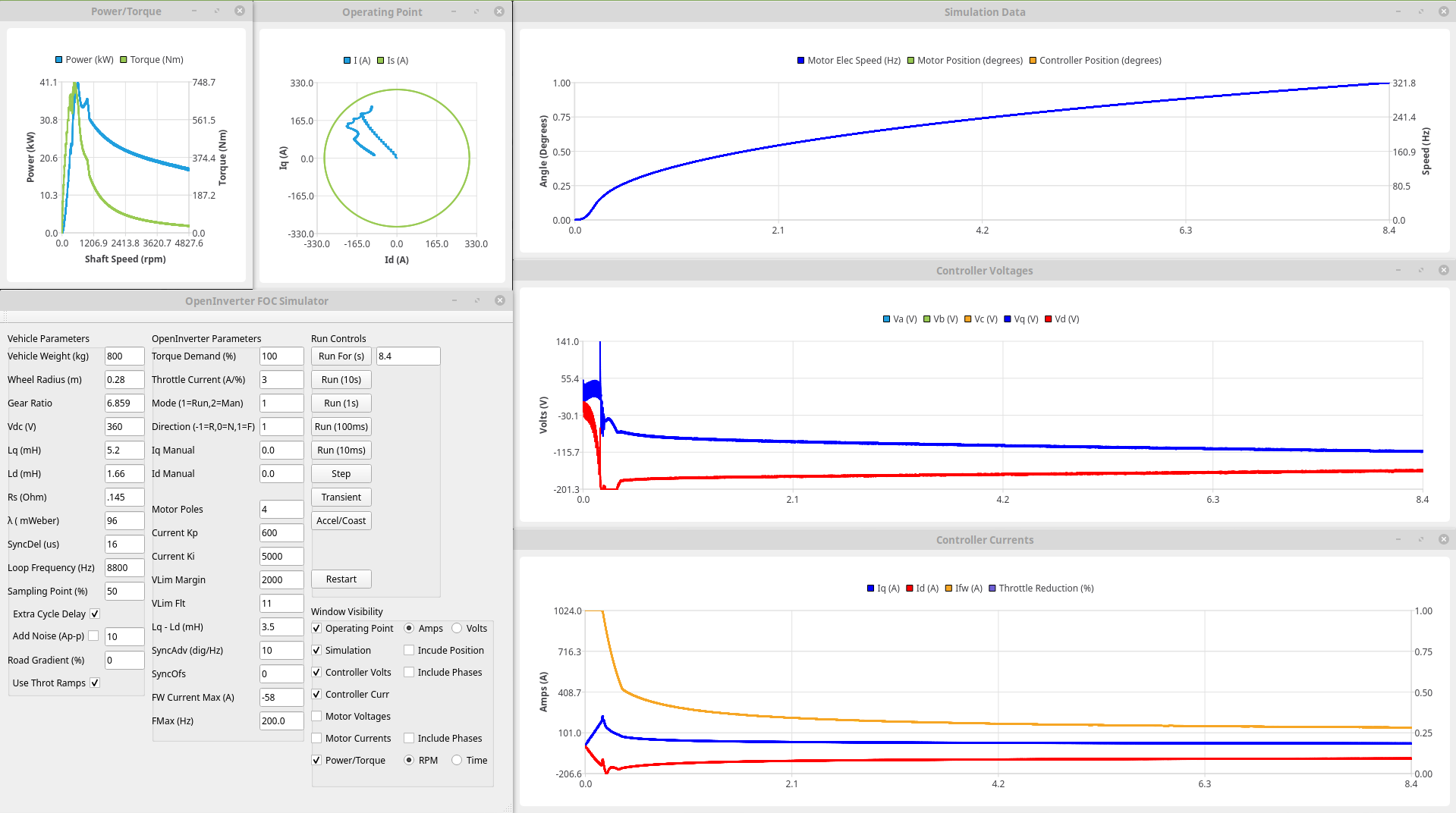 I've also been reading up a bit on Most Torque Per Volt (MTPV) algorithms, in particular, where the operating point should be at each point. Now rather than trying to code stuff up straight away it seemed sensible to test the principle first so here is a plot where I'm trying to over-ride the controllers to force the operating point to roughly where it should be using manualiq and manual id (afraid it only goes up to 2.4krpm because the control loops have an increasing tendency to oscillate if I get it slightly wrong): Now I couldn't get it to go quite where I wanted (and the above took quite a few attempts to get anywhere close) but the peak power is up to 32kW (ish, I saw nearer 35 on one run) and is still up at 24kW at 2400rpm so a gain of around 25%. I'm sure there is more there too once the operating point is right over where it should be (following the Is circle round before heading to the critical current point), at least another 10%?