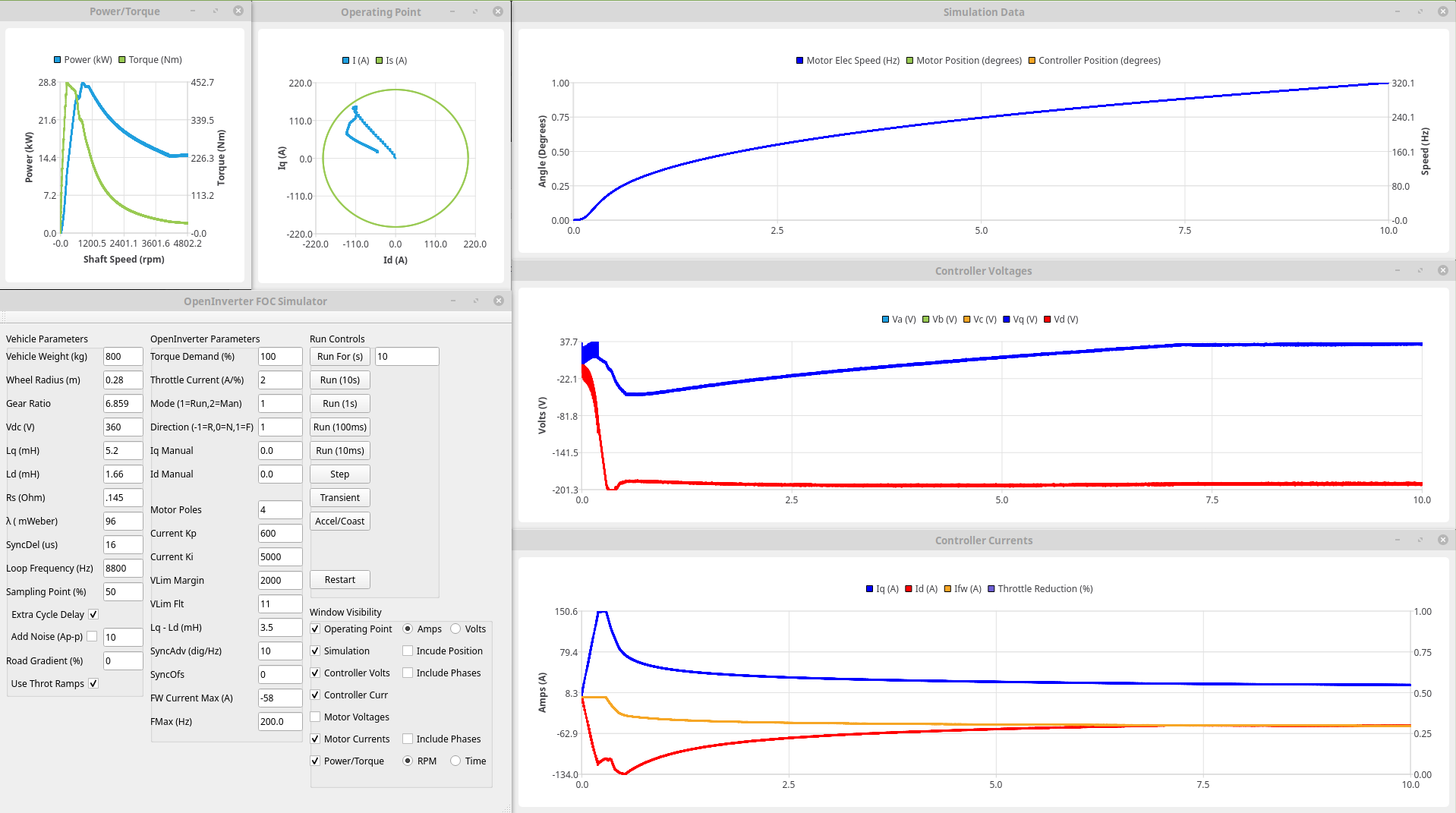It looks sensible, above 40Hz (which is roughly where MTPA runs out of steam and fw starts to come in in the above plots) it starts following the MTPV curve and moving current from Iq to Id. This reduces Vd and holds the total motor voltage stable at 200V (this is the value used in spreadsheet for udc/2). Once the speed gets to around 140Hz this is no longer enough and this is where the operating point would need to start moving from the MTPV point towards the critical current point (throttle reduction).