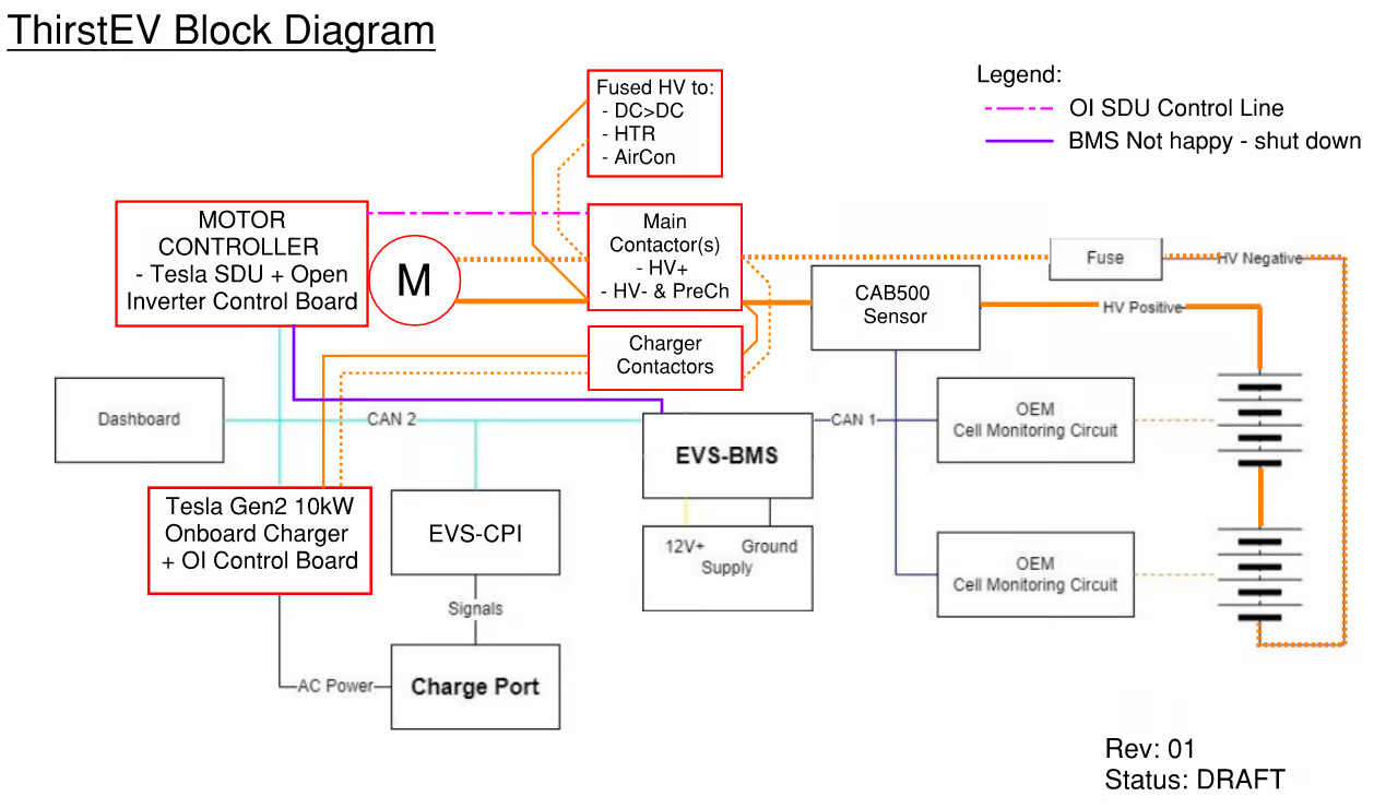 Hi, yeah there are 100s of ways to do this and I've spent quite a while on this with my main drivers being:jetpax wrote: ↑Fri Mar 24, 2023 5:58 am Great to see a open discussion on this as I've also been agonising over all the possible ways of architecting my own system. My current layout looks basically the same as yours, but I'm using M3 DU with an as yet undetermined VCU (a bit heretical to say it on OpenInverter even as a Damien patron, and being in awe of @johu but I'd really like to crack the pairing process as T2C and Ingenext have done).