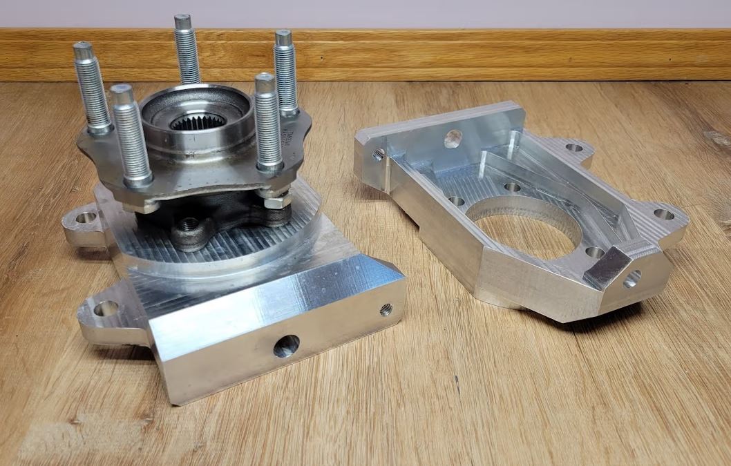 This is the aforementioned Leaf hub on the new uprights I designed. I pressed the OEM studs out and replaced them with 1/2" studs to match what was on the axle I removed. The PCD was the same, thankfully, so no need to do anything with adapters or mismatched wheels. I even managed to get them to accept the Ford Mustang brakes that were already on the car.