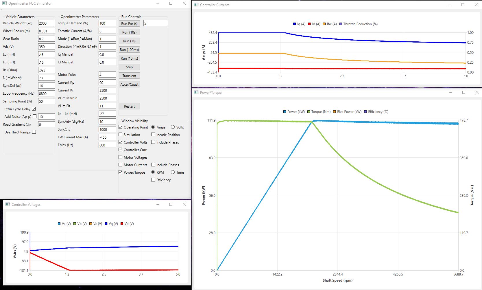 Well I have heard of people pulling 1000 amps from the gen 1 packs (admittedly those were arranged in 3P and mine are 2P). I kind of figured that if I wanted to make about 120kW then I'd be pulling somewhere around 350-400 amps. Here's the latest from my testing in the simulation software. I was meaning to ask if the Iq line in the controller currents chart represented actual current from the battery. If so, it looks like peak draw could be closer to 500 amps, although that's also while developing more torque than I could possibly put to the ground. In fact, if I think I am making more than twice as much torque as I could actually use in the low end, I might want to hit up Bratitude for a set of his 4.35:1 gears when they're ready.