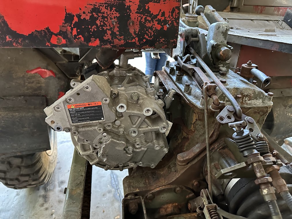 Space for mechanical components is not an issue in the truck, but the original design is pushing the engine forward because of the frame crossmember, which explains the length of the gearbox input axle. I am looking at potentially installing the motor on the side of the gearbox, shortening and rewelding the input axle, and build a plate mating the front of the gearbox to the front of the engine (side by side). The side of the gearbox has also plenty of attach points to solidely anchor the motor with the gearbox. Keeping a ratio of 1:1 should be fine (the truck gets to 107kph at 5500rpm with the original petrol engine). The next mechanical problem is how to transfer the rotation from one axle to the other axle. I do not plan to run a clutch, the 280Nm of the EM61 in stock form will easily surpass the 158Nm at 3200 rpm of the original engine.