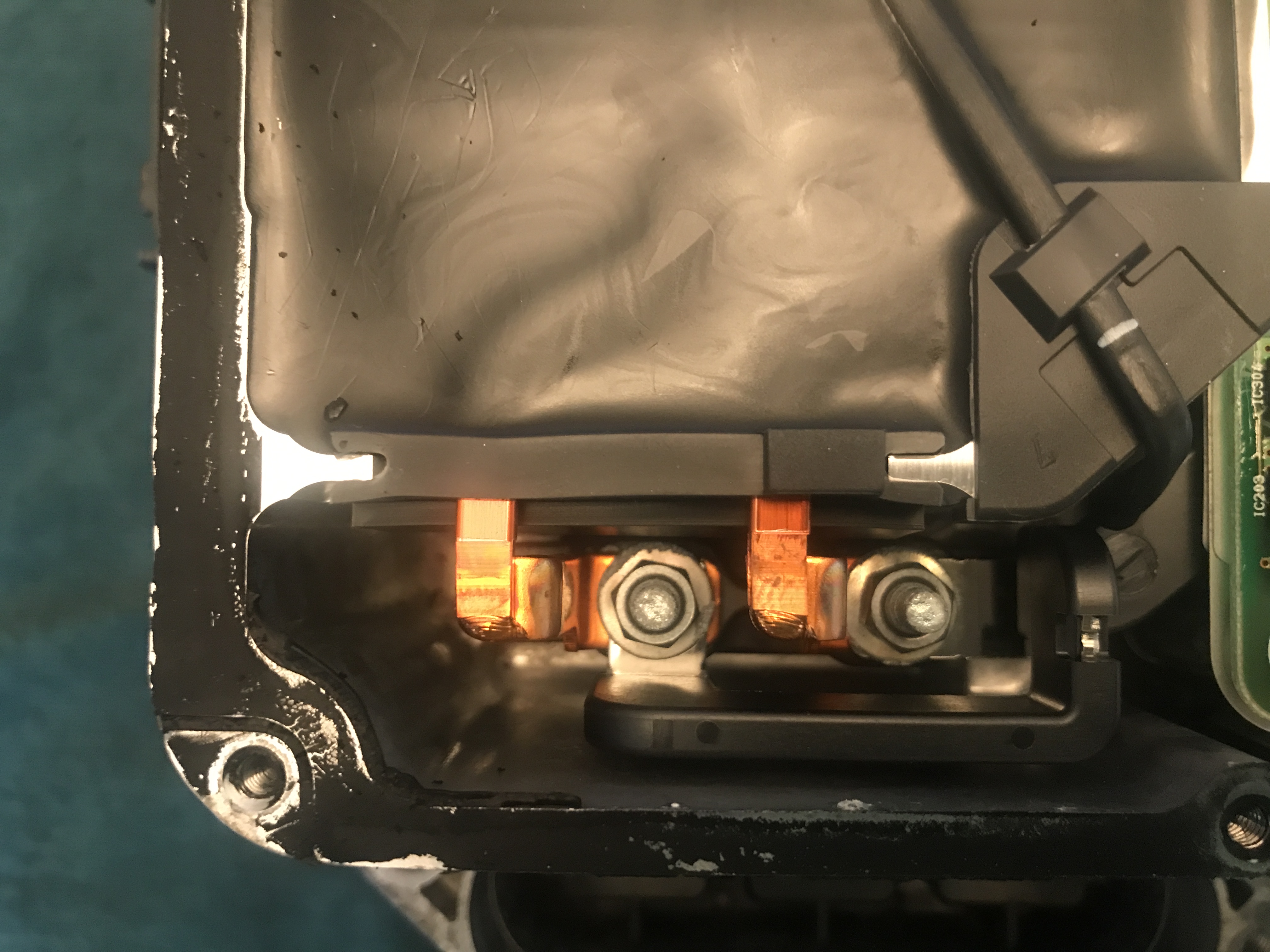 with that connector removed the bus bars need to be rebolted together, I used the old painter tape trick to keep the 10mm nut from falling into the abyss