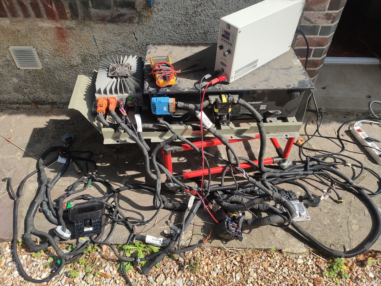 I put everything outside the first day and I checked the battery voltage by opening it. I reconnected everything I tried to charge it. This system need a auxiliary 12V battery as almost all EV. I used a lab power supply to put 12V on the auxiliary battery connector. Reconnected all the chassis ground and put 0V on it. Plugged the 230V power outlet. The display powered up and shown an error message. Asking me to set the hand break. I found the connector by guessing (I didn't do the full tear down) and after few check I short it. Tada ! the charge started.