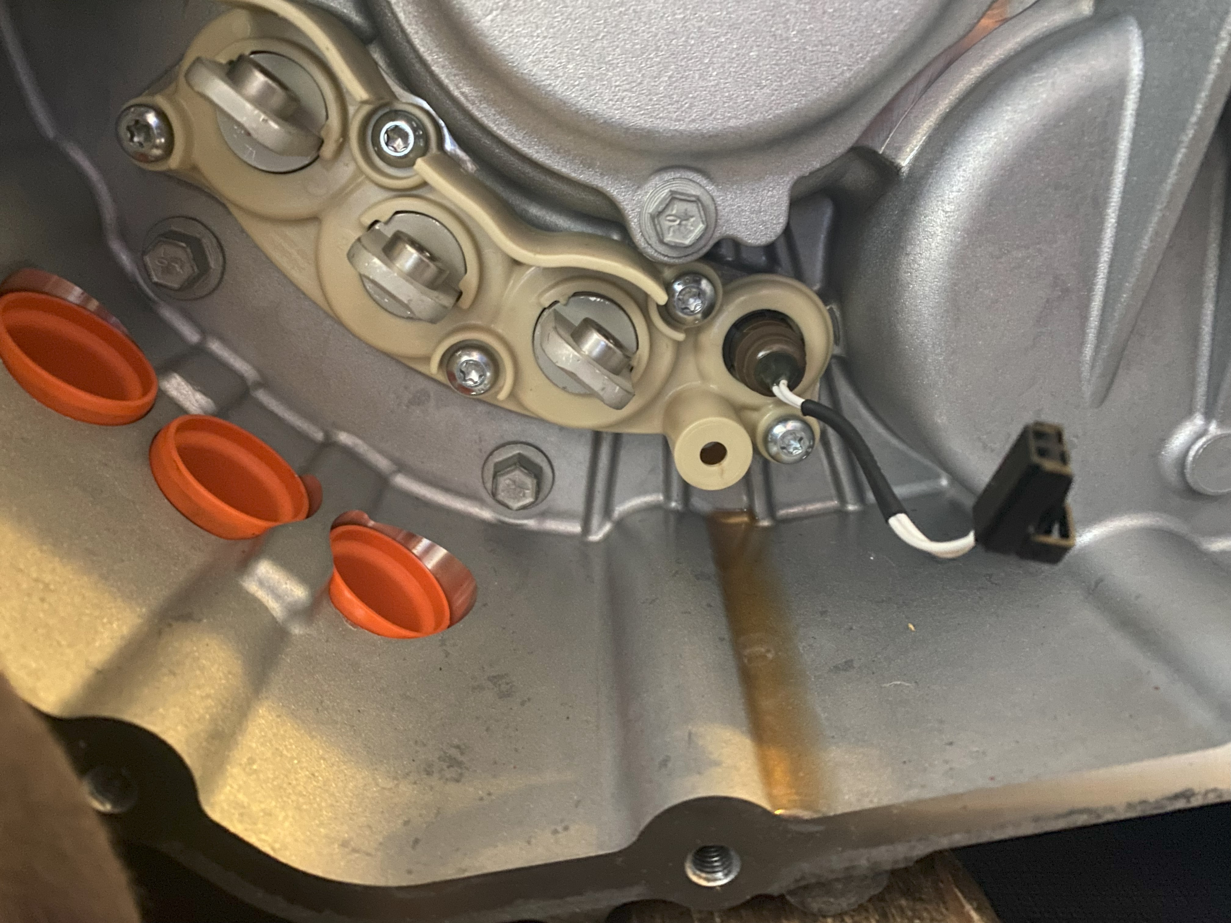 Today, I was ready to spin it. Wanted to do a basic motor test before applying HV. Pulled the below orange rubber plug (phases connections cover) and lot's of fresh gearbox oil poured out. I quickly plugged it back, but quite a bit came out.
