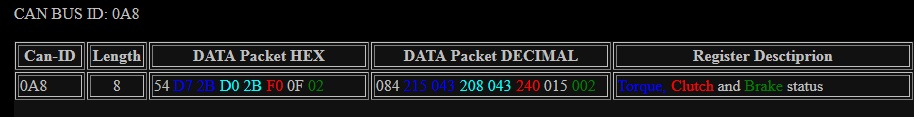 Byte 7 = Brake:- 0,1,2 or 3 = Brake released, 32,67,98 or 99 = Brake pressed.
