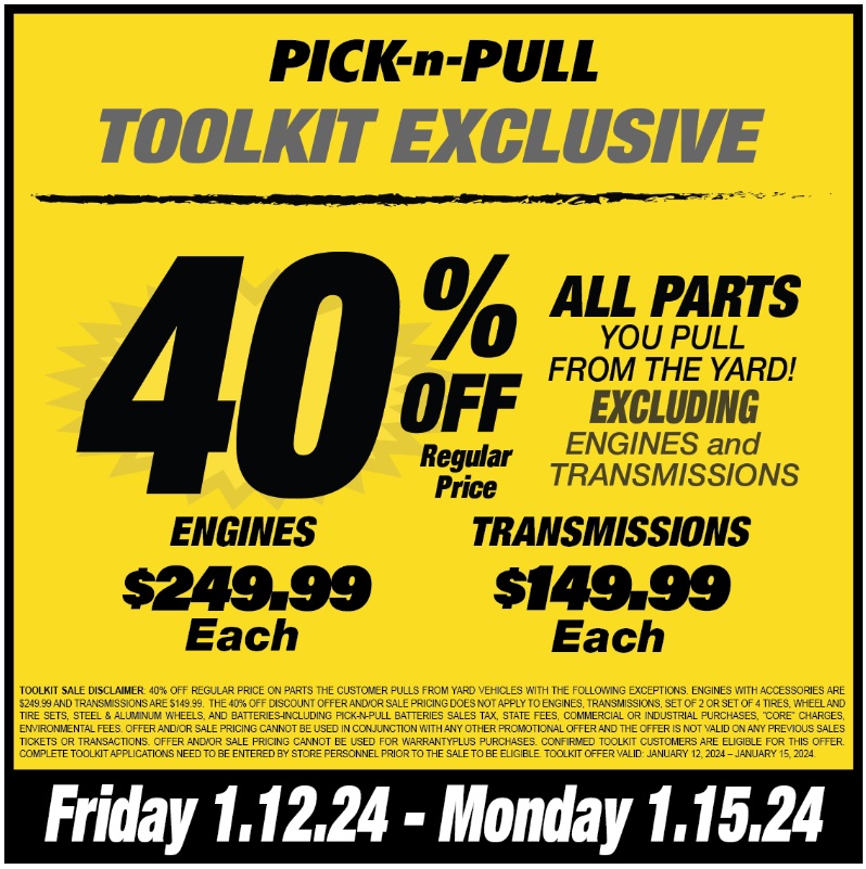 "Established in 1987, the Pick-n-Pull chain of self-service auto parts stores is one of the largest recyclers of end-of-life vehicles in the industry. You bring your tools, pull the parts you need and SAVE lots of money! Pick-n-Pull opened their first store in Stockton, CA in 1984 and has since grown to 46 U.S. and 4 Canadian locations."