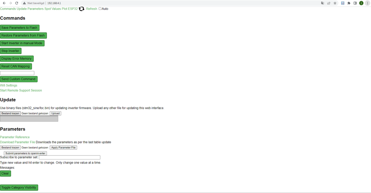 i am ev converting a g-wagon with a tesla sdu setup. this setup has a openinverter board and is running good. i am now trying to add the esp32 canlite module to this setup due to the inverter wifi signal not reachin the cabin. i am having trouble with this as i get no paramaters or spotvalues in the esp32 interface. i added a picture of this interface. simultaniously also the interface of the inverter has changed. i added a picture of this changed interface too. at this point a can no longer see any spot values or change any parameters. at one point when connected to the inverter the same interface as the esp32 showed up and all the paramaters and spot values where visible but this was a one time event.