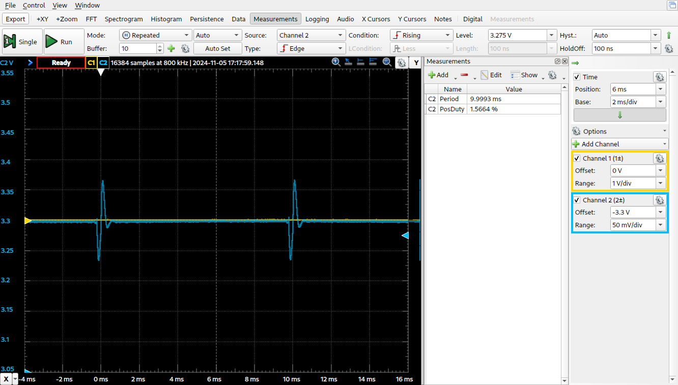 I'm currently working on the Zoe inverter, more specifically on the rotor exciter controller. While testing I noticed a strange, periodic sound from my little test inductor. Scoping the PWM showed it dropping out every second