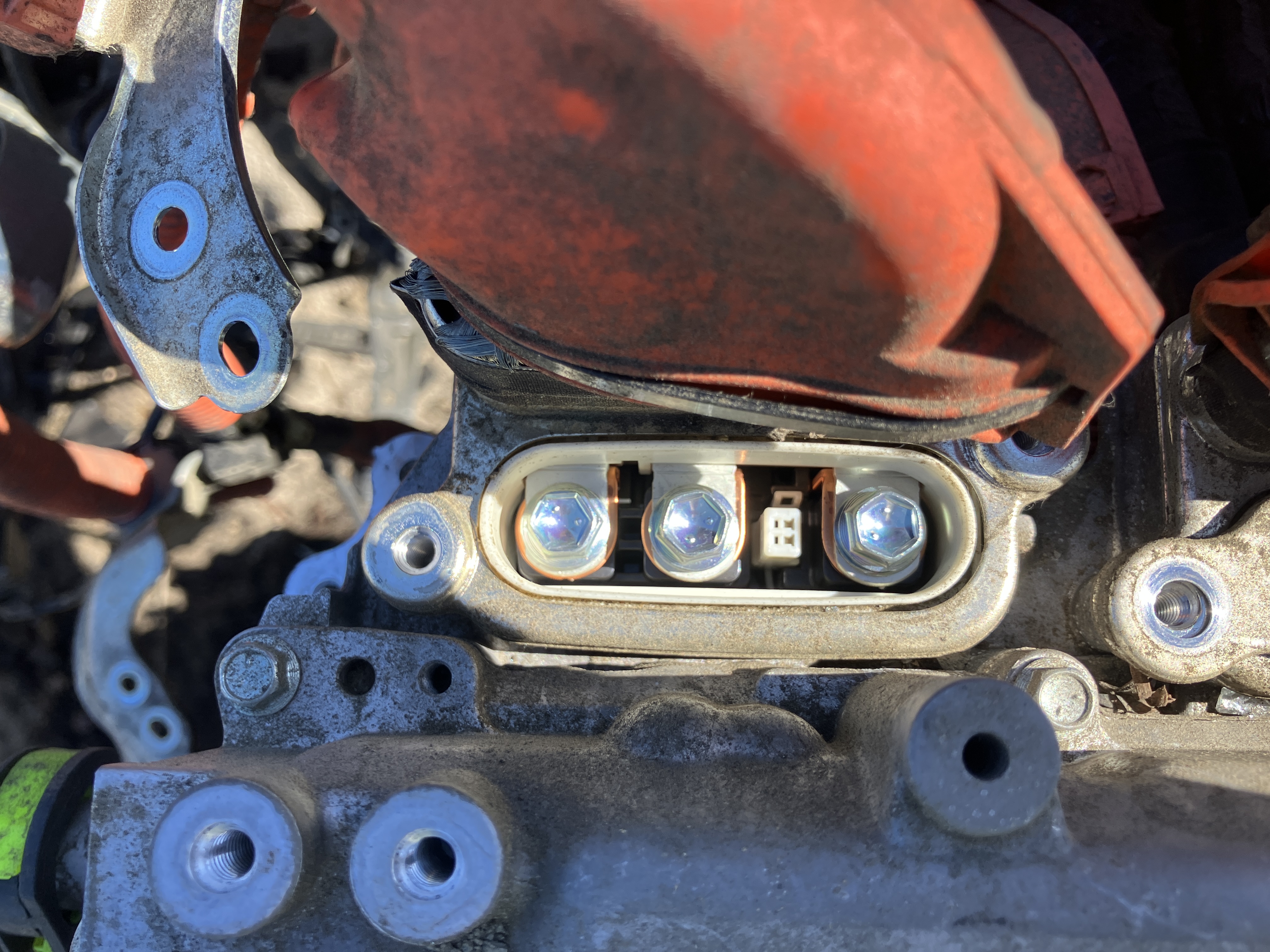 here I am attempting to remove the already severed orange high voltage motor cables (but I end up giving up on removing them as it appears 6 bolts need to be undone and I have a strict 3 bolts or less per component policy, ha ha )