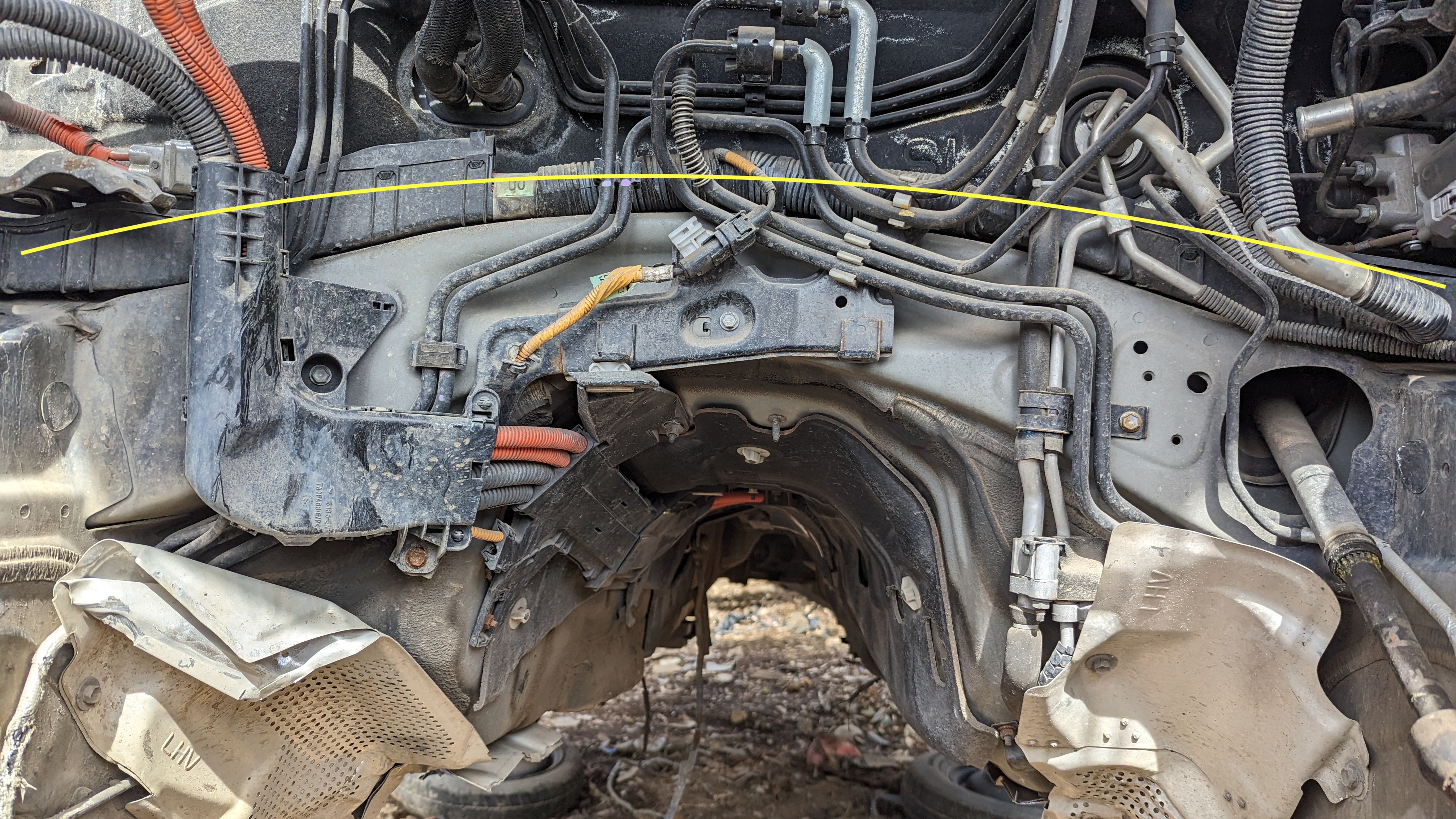 Found the inverter connector in the engine compartment that disappeared into a giant harness that seemed to snake all over plus into the vehicle. It definitely looks trapped behind a bunch of other stuff like oil/coolant/refrigerant lines. (yellow arc in this photo).