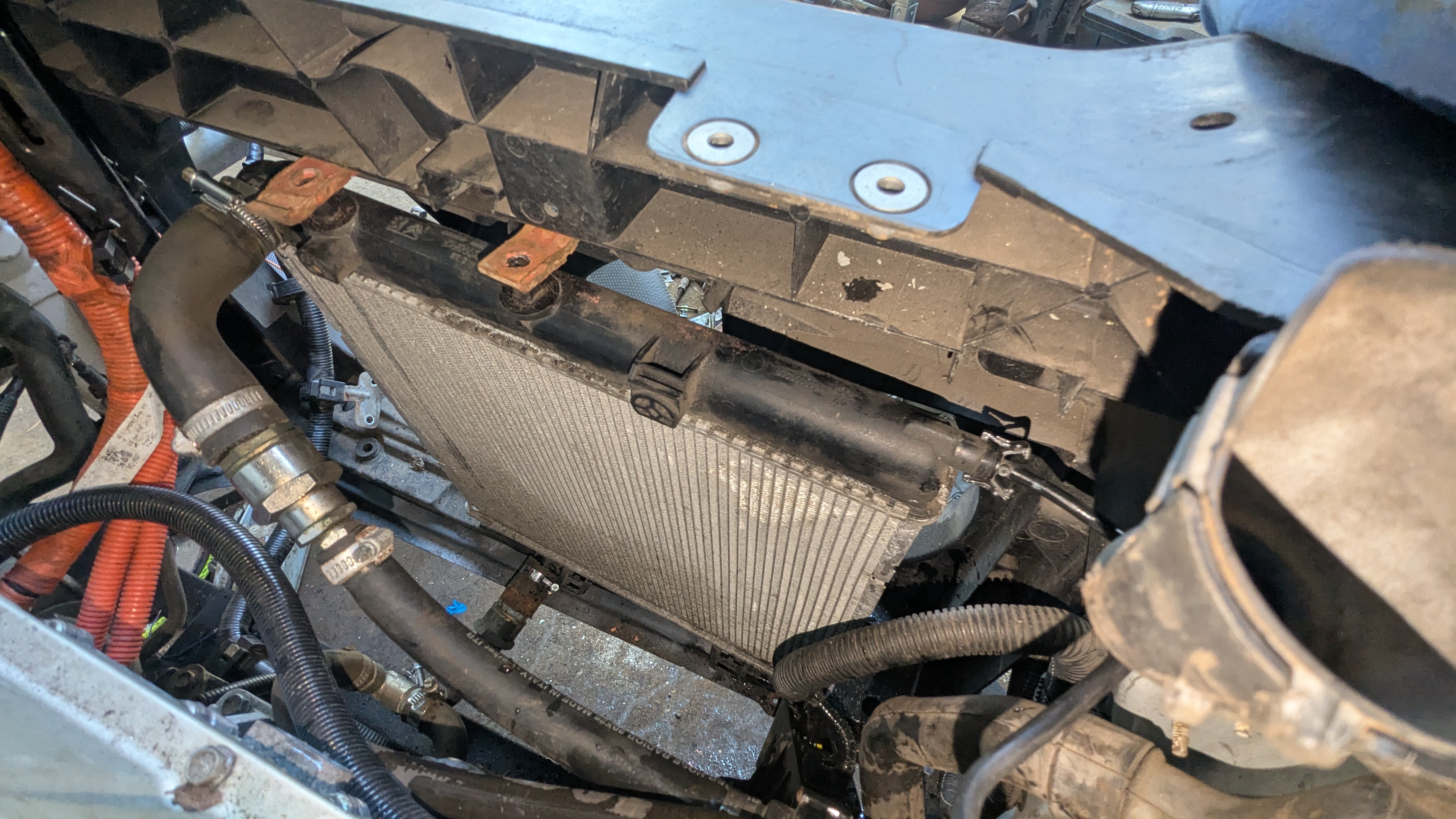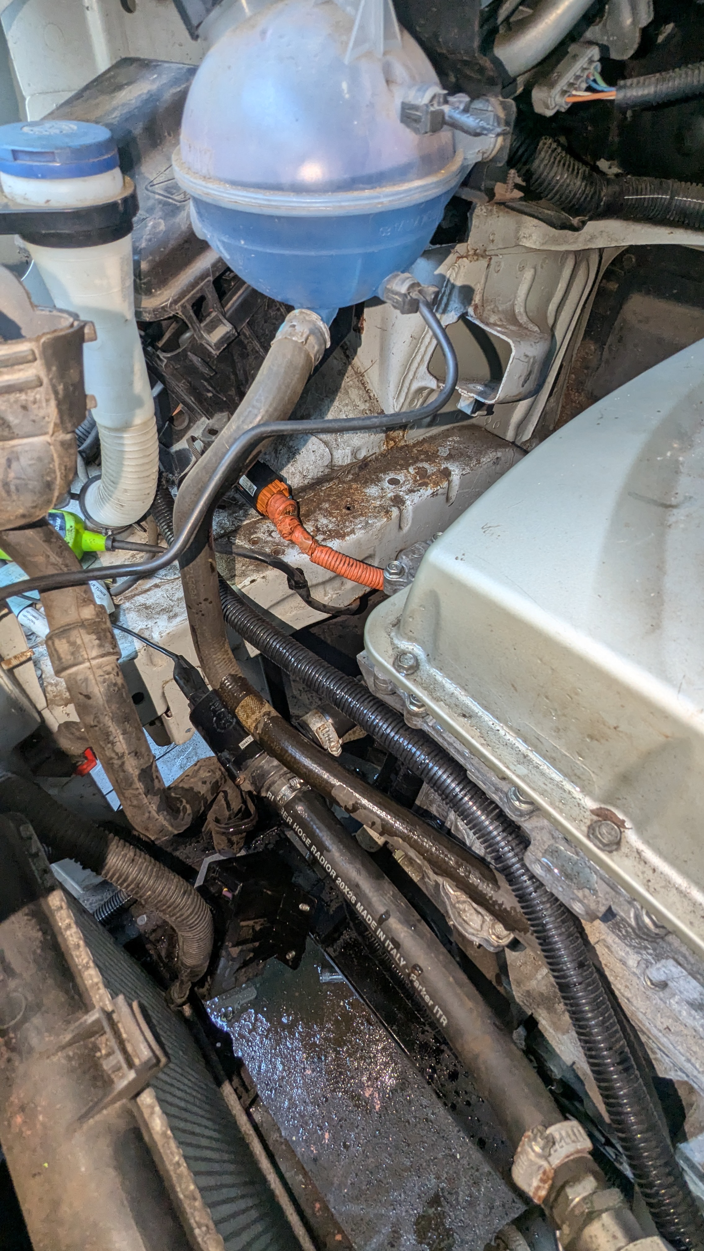 Project update. I've fitted a radiator from a 2008 Peugeot 207 1.4D. The Expert radiator was blocking the charge ports. The new radiator has been moved left to fit the charge ports in. System filled with anti-freeze and bled. I'm using the Allied water pump and a combination of Allied water fittings and Leaf water hoses. It's not pretty but it's functional.