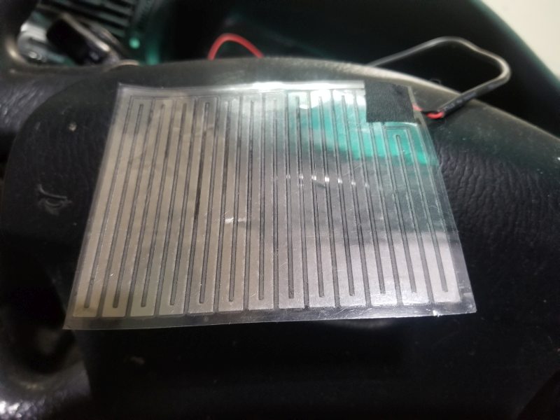 I added a head and tail wrap to the existing gaffer tape wrap to secure the ends better. It was fine with the gaffer tape, but I also added these carbon fiber clip-on steering wheel covers to hide it. The wheel gets too hot without them, and too much in the same place. You can't see the power switch, it's just slightly on the back side, by the spoke. You can reach it with your fingertip.
