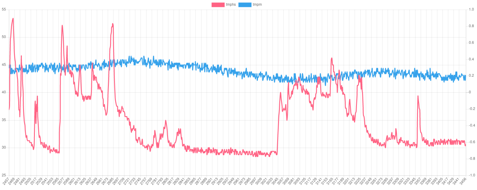 To get at least something I just subtracted 15% from all dutycycles, now I get a very strange behaviour. The supposed temperature rises by up to 50°C within a second when accelerating hard but also drops at the same speed when coming off the accelerator. So I'm not sure if what I'm seeing is really the temperature.