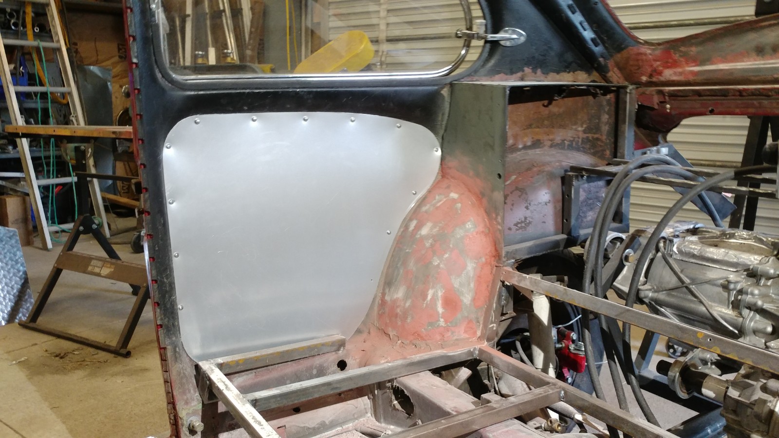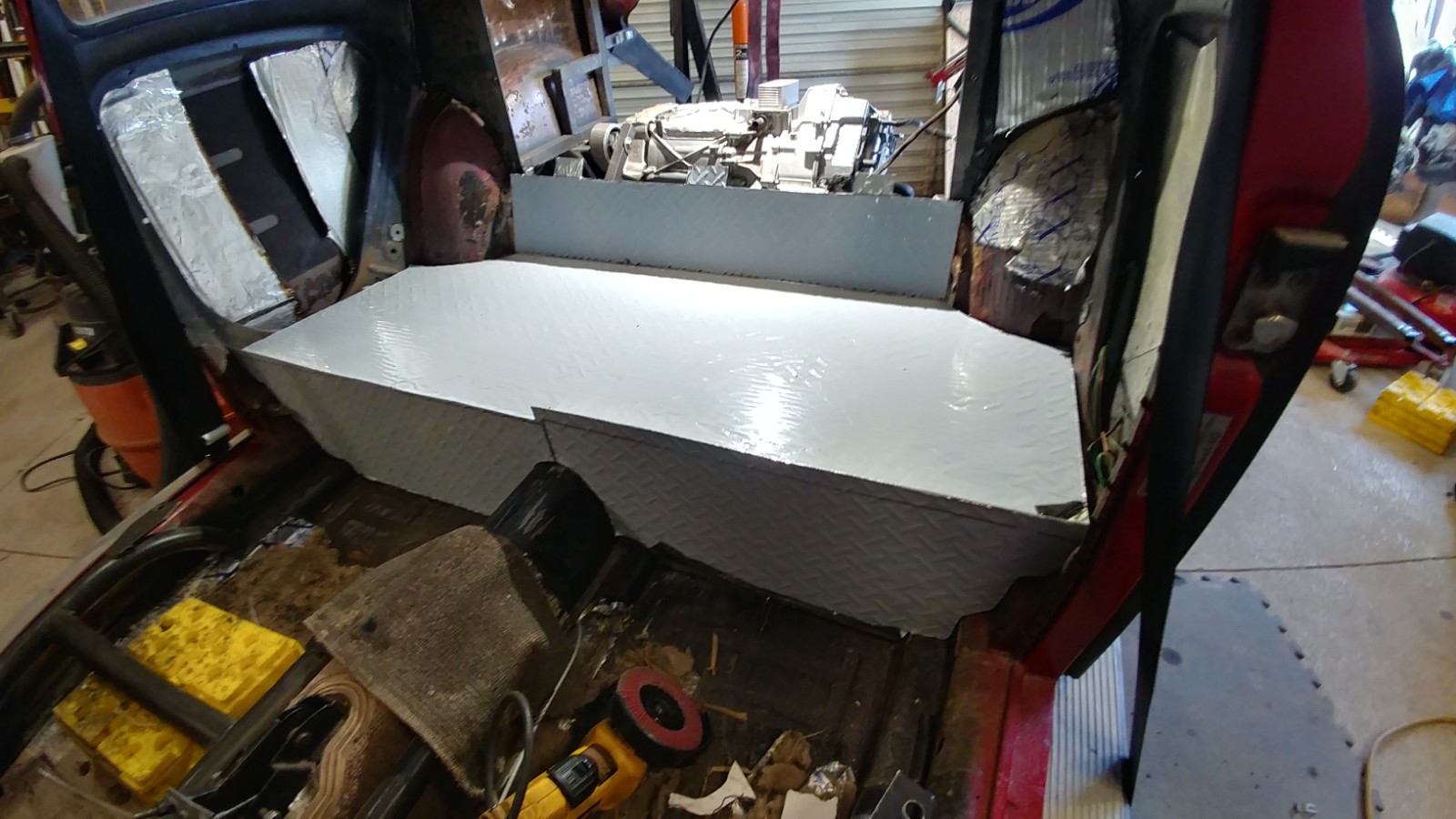 The rear luggage tray and sheetmetal were removed. I added a platform of 1" tube steel. Cardboard templating to get the sheet metal shapes right. Aluminum diamond plate is .040.