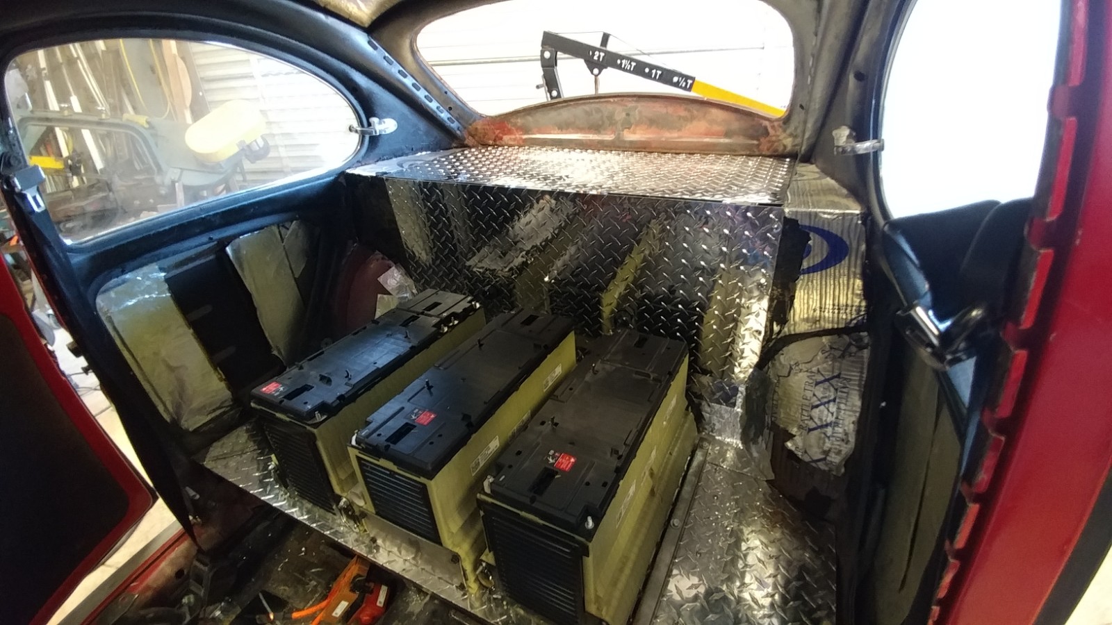 Rivnuts are inserted into the horizontal sheet metal under the batteries. The original c-rail from the Chevy mounting plate is used on either side of the batteries. Aluminum tubes are fit in the gaps between the center battery and outer batteries. Bolting those tubes to the horizontal deck squeezes the batteries out towards the edges. I'll be fabricating a box to go over the batteries which will leave 2 "cubby" type areas available on either side for small packages, etc.