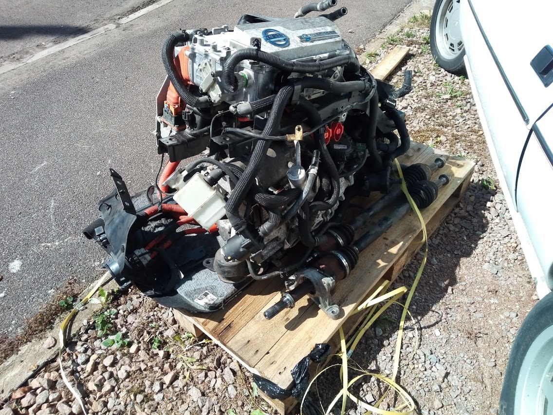 Upon my return I started peeling off the layers of pallet wrap and cardboard. What I saw first was the end of a pair of driveshafts. Once fully exposed is became clear that I had essentially the complete contents of a Gen1 Leaf front compartment, Motor, Inverter, Gearbox, driveshafts, pumps, water heater, even the charge ports.